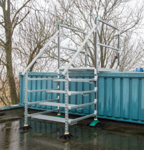 The pipe system extends beyond the interior, reaching the roof, where Walraven designed various mounting systems on different staircases. These custom solutions ensure safe and easy access to rooftop sections. Additionally, the Walraven Yeti® feet provide stability on flat roofs without causing damage from drilling.